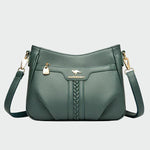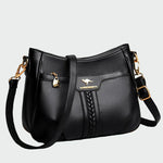 Elegantní dámská taška přes rameno v černé barvě, vyrobená z odolné vysoce kvalitní umělé kůže. Disponuje diskrétním pleteným vzorem ve středu, který dodává zvláštní charakter, zatímco zlaté kovové prvky přidávají pocit luxusu. Nastavitelný popruh umožňuje pohodlné nošení, což z ní činí ideální volbu pro všechny denní hodiny.