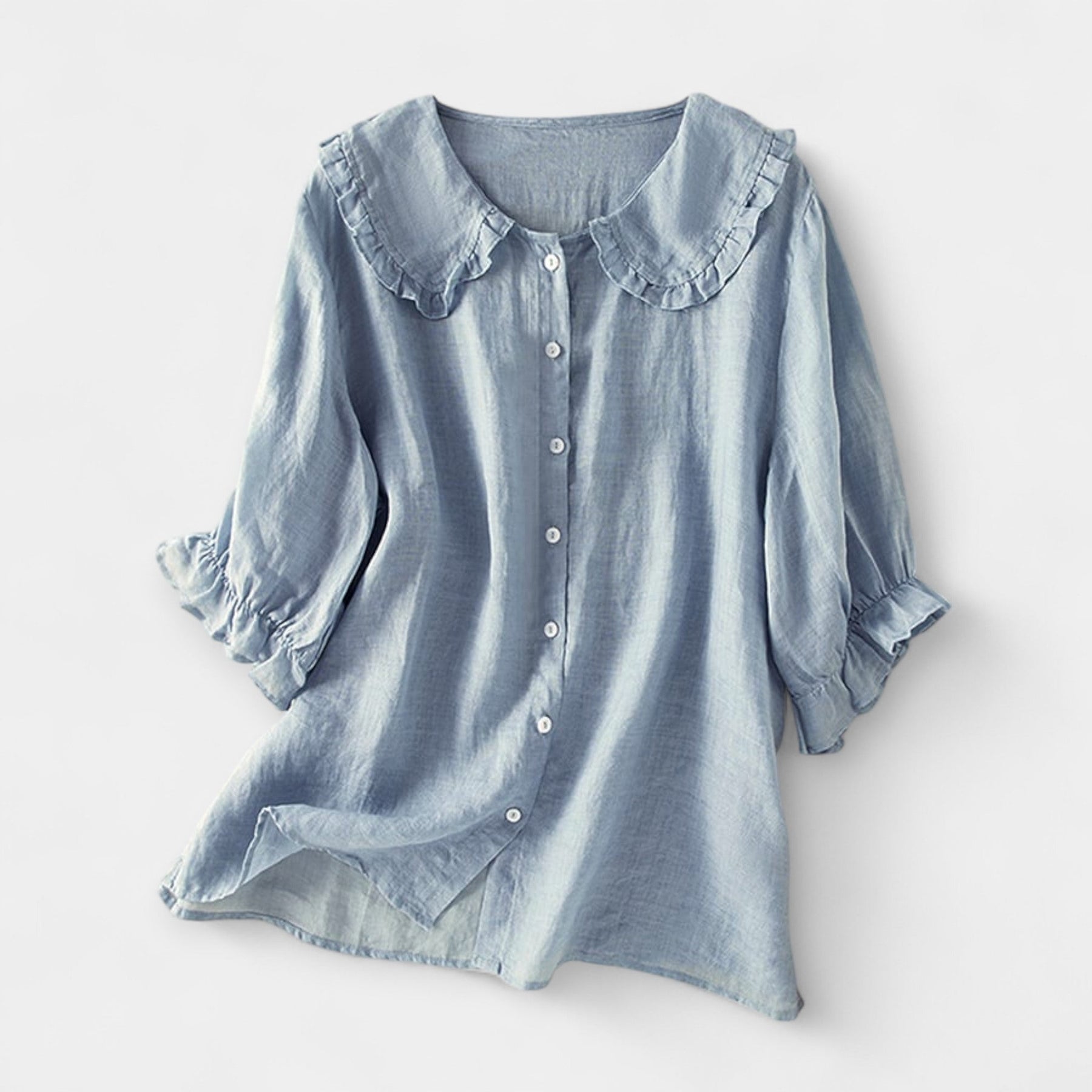 Hravá košile vyrobená z lehké směsi bavlny a lnu, která kombinuje eleganci a pohodlí. Dekorativní límec ve stylu Peter Pan s volánky přidává unikátní detail, který pozvedne jakýkoli ležérní outfit, ideální k sukním nebo kalhotám.