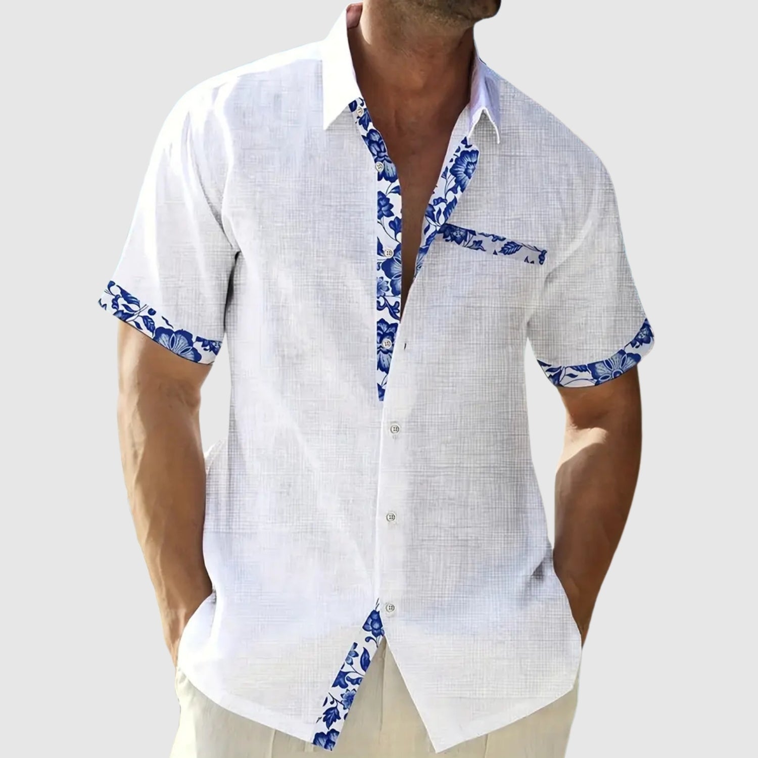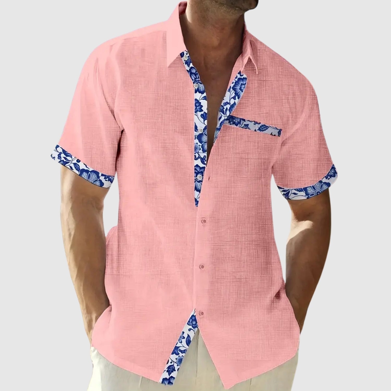 Tato košile s krátkými rukávy, navržená pro slunečné dny, kombinuje svěžest a eleganci s nádechem živosti. Kontrastní detaily na límci, kapse a rukávech dodávají charakteru uvolněnému vzhledu, který je ideální na pláž, do města nebo na letní výlet.