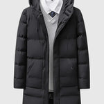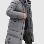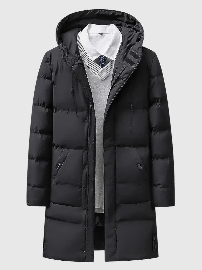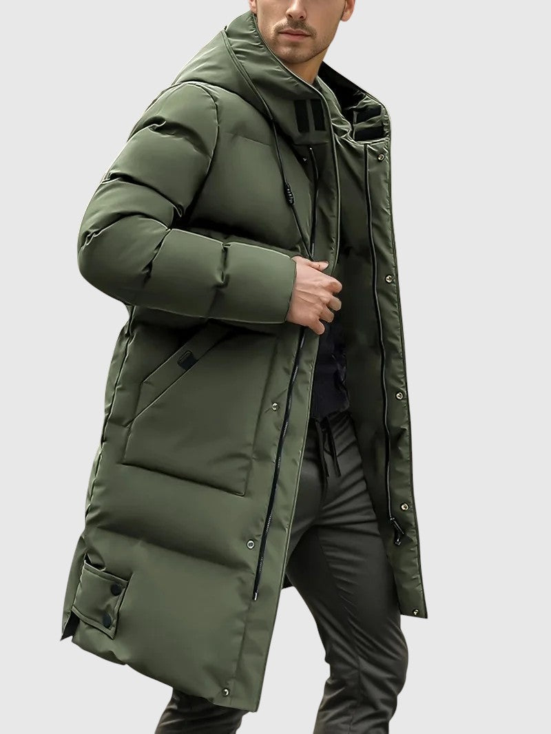 Dlouhý kabát s moderním střihem, navržený tak, aby poskytoval maximální ochranu a pohodlí v chladných dnech. Prošívaná výplň zajišťuje účinnou izolaci, zatímco kapuce a vysoký límec posilují ochranu proti větru a nízkým teplotám. Funkční kapsy a zapínání na knoflíky dodávají praktičnost elegantnímu designu, díky čemuž je tento kousek univerzální pro městský život i volný čas.
