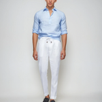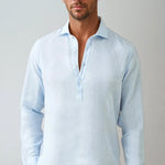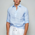 Lněná Pop-over Košile – Světle Modrá je ideální pro formální i neformální příležitosti. Noste ji s lněnými kalhotami pro letní vzhled nebo ji kombinujte s chinos pro elegantní smart-casual vzhled.