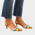 Tyto barevné lodičky s nízkými podpatky kombinují komfort a hravou eleganci. Odtíny modré, žluté a hnědé vytvářejí živou kombinaci, která dodává charakter každému vzhledu. Jejich elegantní design s tenkým páskem kolem kotníku zajišťuje stabilitu a decentní eleganci, která se hodí na každou příležitost.