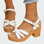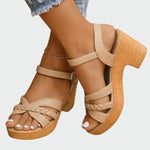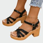 Moderní černé sandály s platformou a podpatkem, ideální pro každodenní vzhled s stylem a pohodlím. Kombinace pletených pásků vpředu s klasickými liniemi dodává eleganci, zatímco hnědá korková podrážka přináší letní atmosféru.