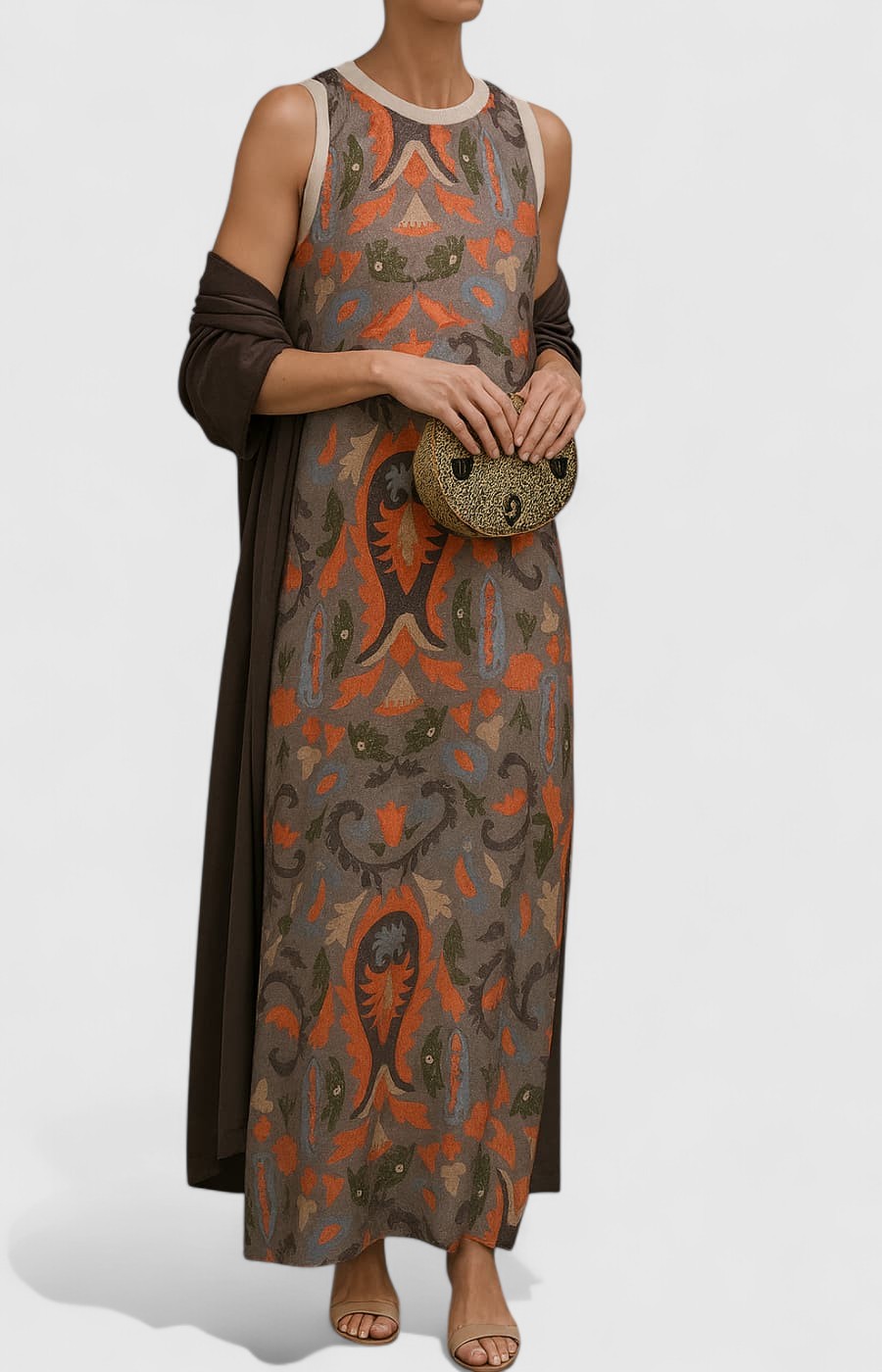 Tento set zahrnuje elegantní dlouhé šaty a odpovídající šál, navržené tak, aby se dokonale doplňovaly.