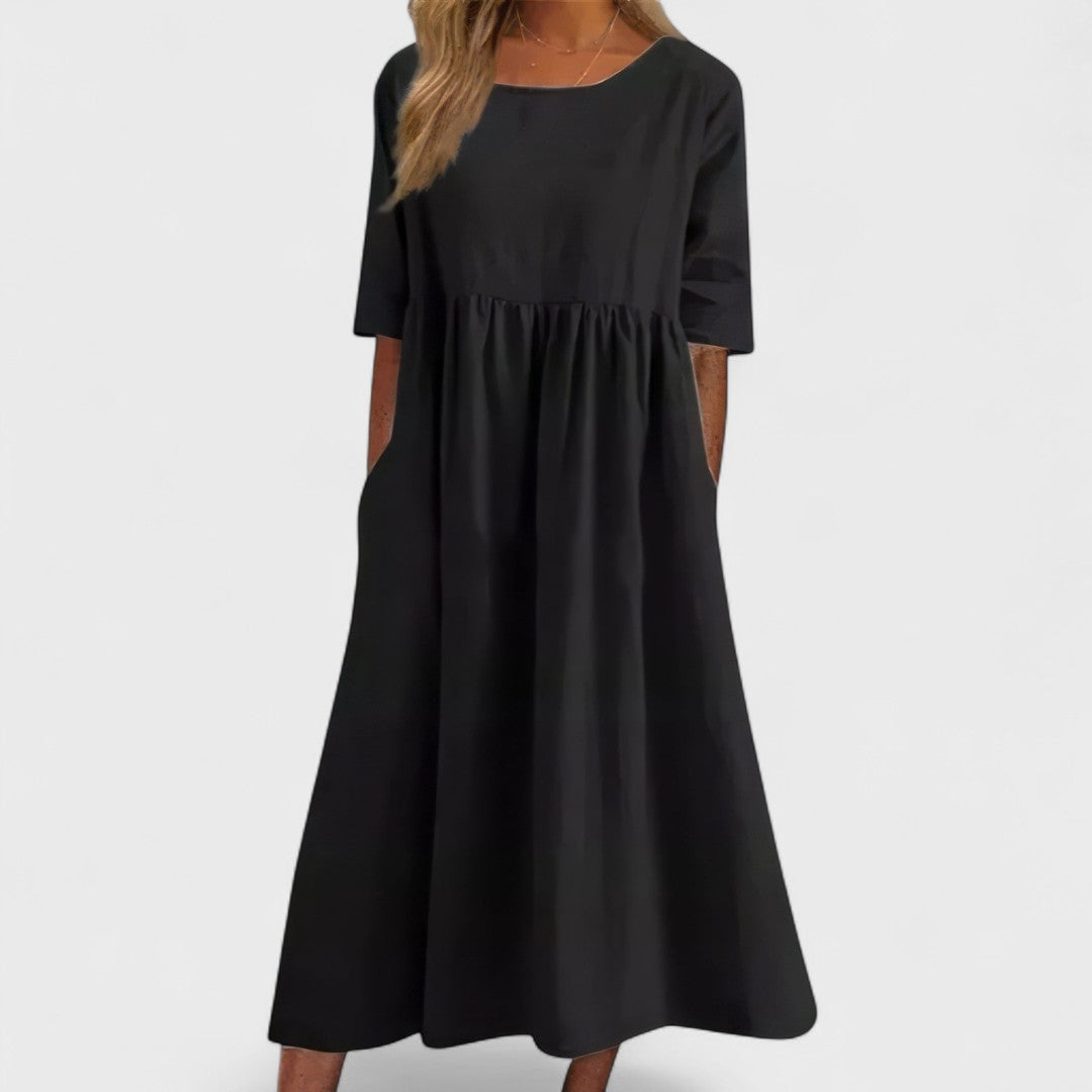 Šaty Sofia vynikají svým minimalistickým, přesto moderním designem. Vyrobené z kvalitní bavlněné směsi, která je jemná, prodyšná a příjemná k pokožce, ideální i v horkých dnech. Střih do áčka s volně padnoucí sukní přirozeně lichotí postavě, zatímco decentní výstřih dodává jemný ženský akcent. Jednoduchost modelu umožňuje snadné stylování – od sandálů po tenisky či doplňky.