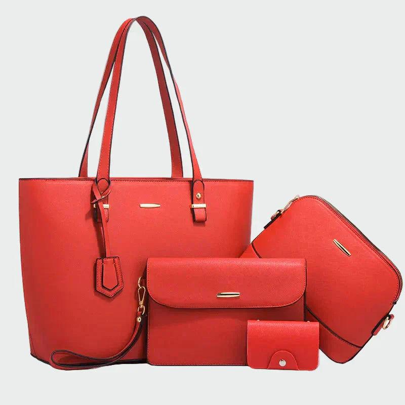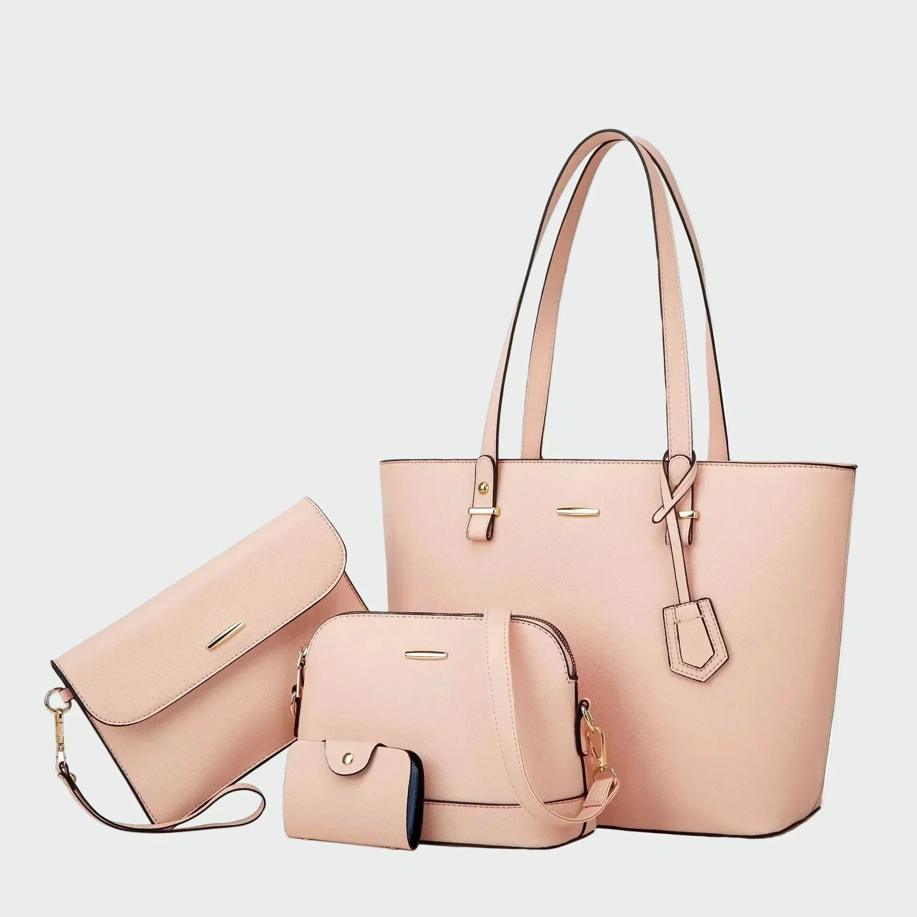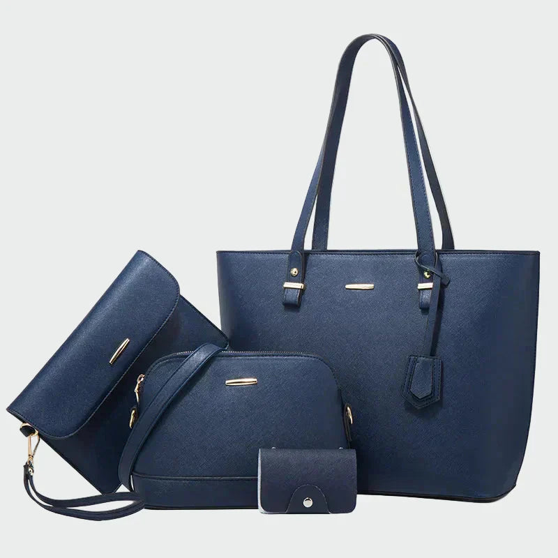 Sada tašek v černém odstínu, která kombinuje eleganci a praktičnost v každém detailu. Skládá se z velké tašky přes rameno, menší křížové tašky, obálky a peněženky, vše s minimalistickým designem a zlatými detaily, které dodávají luxusní charakter. Prostorný interiér a více možností nošení ji činí ideální pro každodenní použití, ale i pro elegantnější příležitosti. Kompletní sada, která pokryje všechny vaše potřeby se stylem.