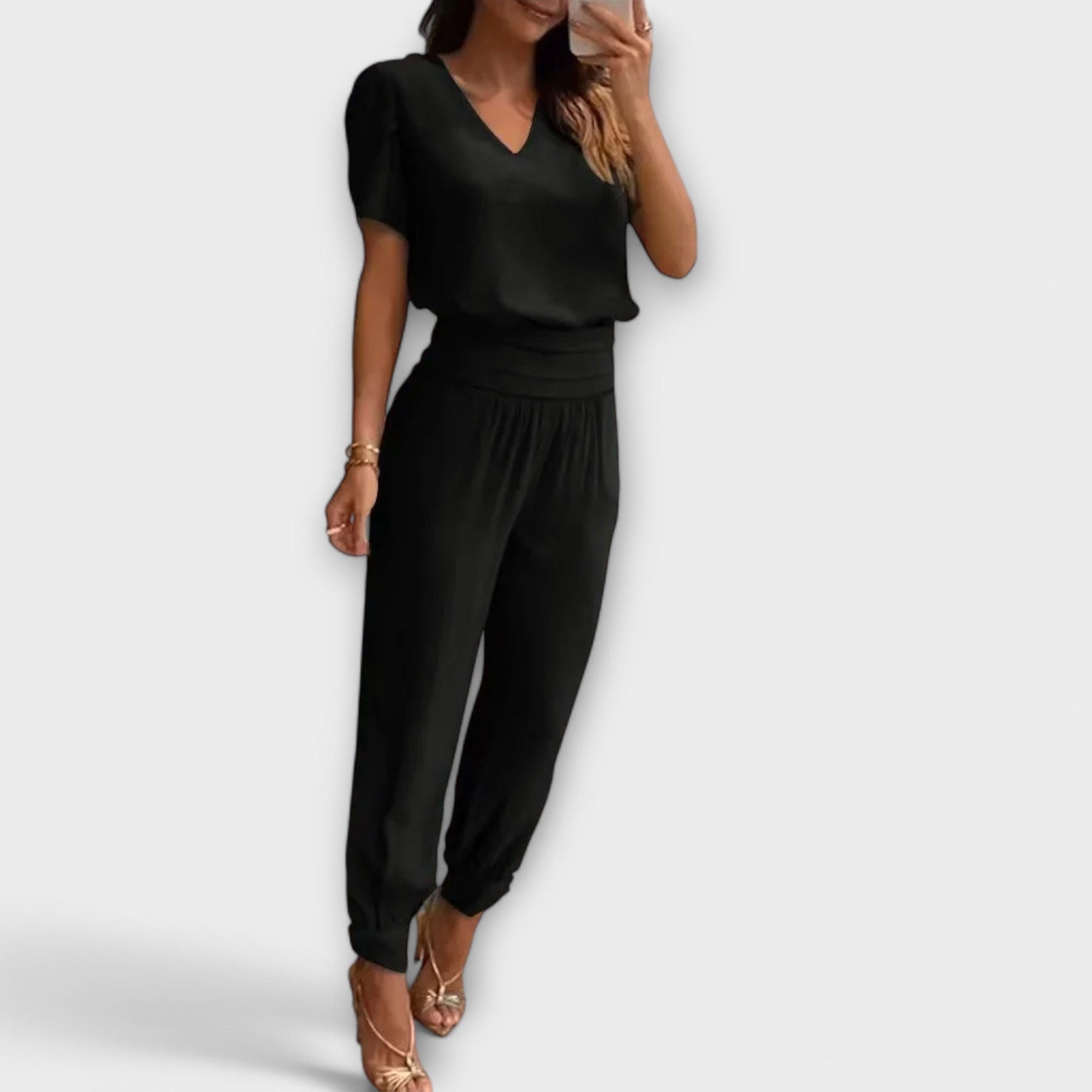Set Irmelin – Elegantní set s topem a kalhotami spojuje moderní design s maximálním komfortem nošení. Lichotivý střih zvýrazňuje postavu, zatímco kvalitní materiály zajišťují příjemný pocit při nošení. Ať už na uvolněnou procházku městem nebo na formální schůzku – tento set je ideální volbou pro všestranné vzhledy.
