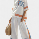 Strukturovaná svěžest s námořním pocitem. Souprava Daisy vyniká čistým a moderním designem, obohaceným o ručně vyráběné detaily v živých barvách. Široká blůza a kalhoty s širokými nohavicemi vytvářejí uvolněnou siluetu, která přenáší lehkost a styl s osobností.