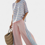 Sladkost a lehkost v každém kroku. Sada Daisy v odstínech růžové a modré kombinuje top s vlnitými liniemi s širokými a nadýchanými kalhotami, čímž vytváří svěží a pohodlnou estetiku ideální pro slunečné dny u moře.