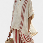 Relaxace s námořním charakterem. Kostým Daisy kombinuje volnou blůzu s výstřihem do V a široké kalhoty s vertikálními pruhy, které prodlužují siluetu. Jeho tekutý design a textilní materiál činí ideální volbou pro užívání si slunečných dnů s pohodlím a stylem.